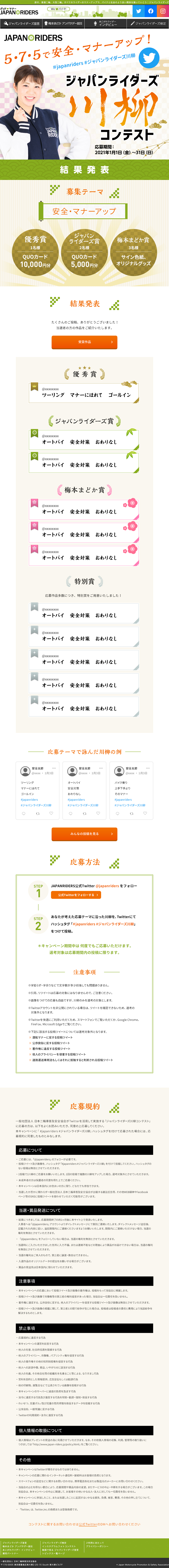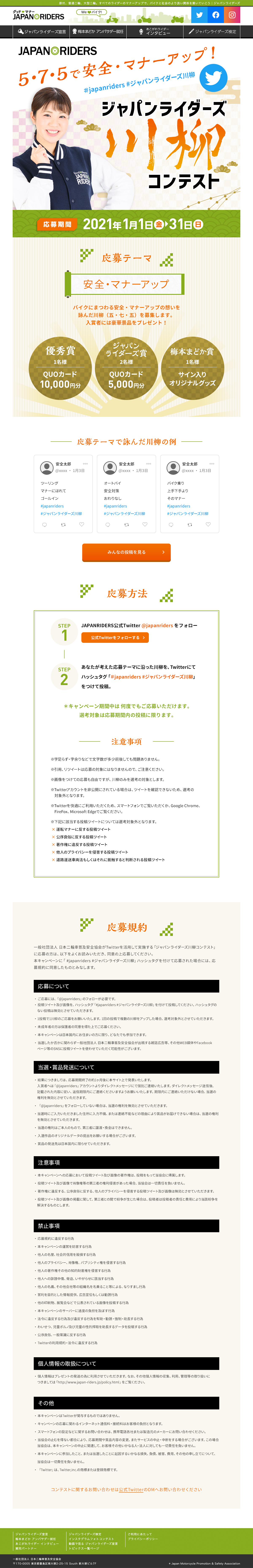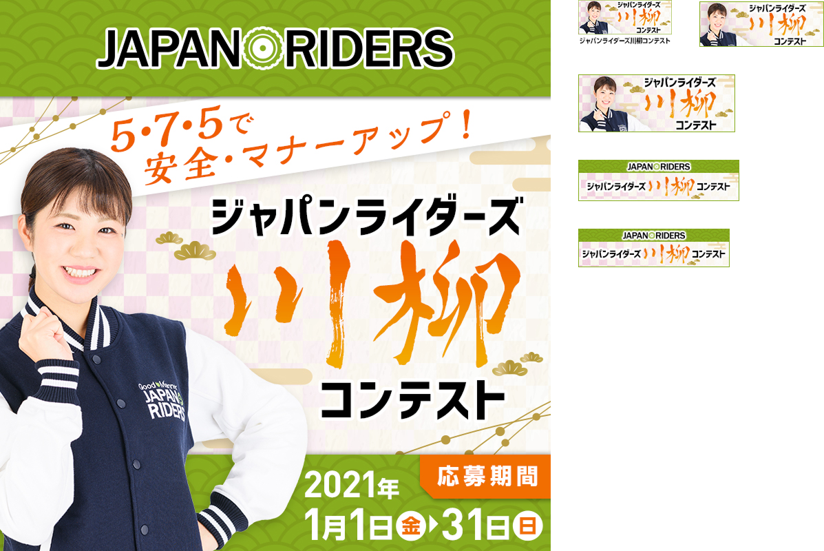 公式アンバサダー・梅本まどかさんを中心として構成。ジャパンライダーズのロゴイメージカラーである黄緑・募集内容である川柳とのイメージで和風デザインとしました。